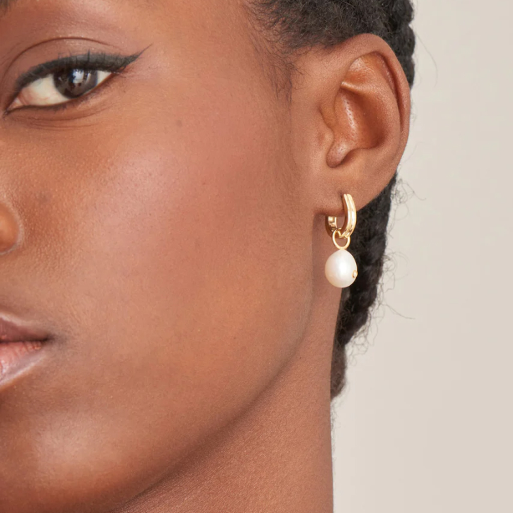 Mit diesen eleganten Huggie Hoops mit Perlentropfen können Sie Ihren Ohrschmuck mit einer perfekten Kombination aus Perlmuttschimmer und Funkeln aufwerten. Der klobige goldene Huggie Hoop ist mit einem schwebenden, irisierenden Perlentropfen verbunden, der mit einem einzelnen Zirkoniastein für das ganze saisonale Funkeln vollendet wird. Kombinieren Sie sie mit alltäglichen Huggies und Ohrsteckern zu einem einzigartigen Stapel.