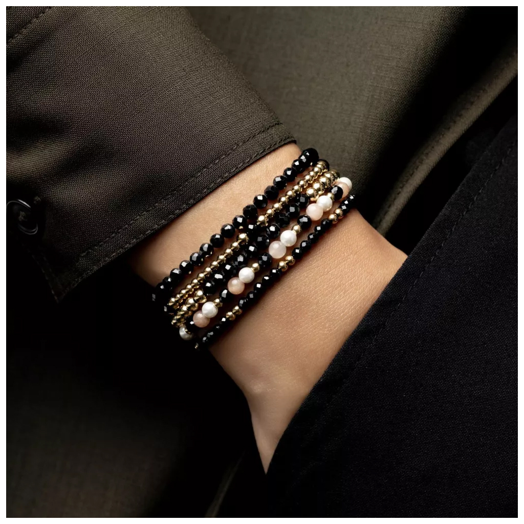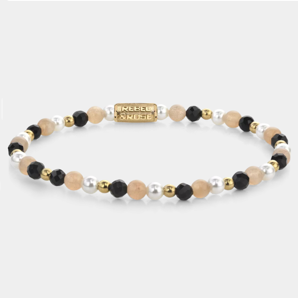 Edelsteinperlenarmband, handgefertigt aus 4mm Steinen (Schwarzer Spinell, Muschelperle, Sonnenstein, goldfarbene Steine) mit einer 18 Karat ionenbeschichtet Schließe. Der Rebel & Rose Schmuck lässt sich einfach mit unseren anderen Perlenarmbändern kombinieren.
