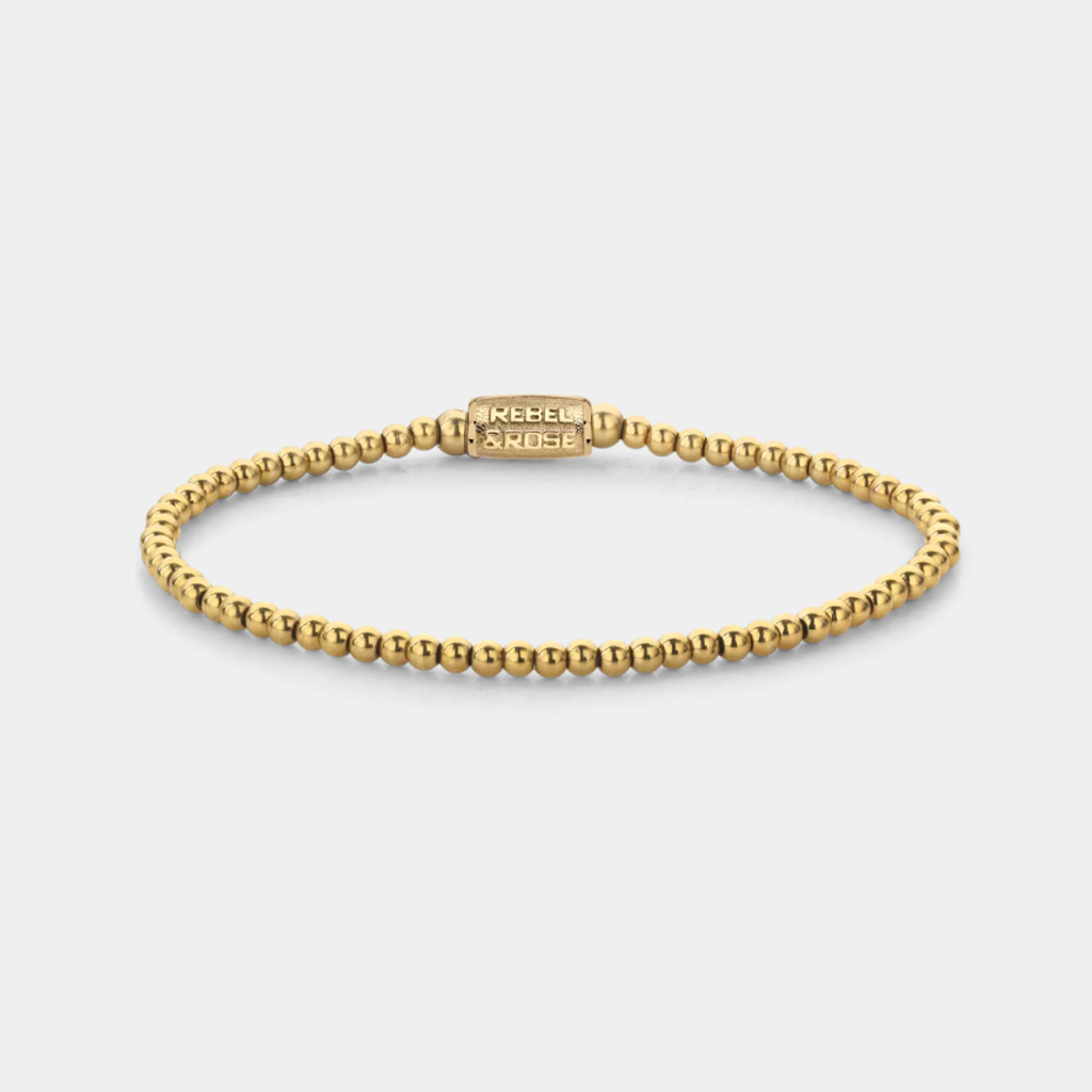 Perlenarmband, handgefertigt aus 3 mm großen Steinen aus 18 Karat ionenvergoldetem Edelstahl mit einem Verschluss aus 18 Karat ionenvergoldetem Edelstahl.