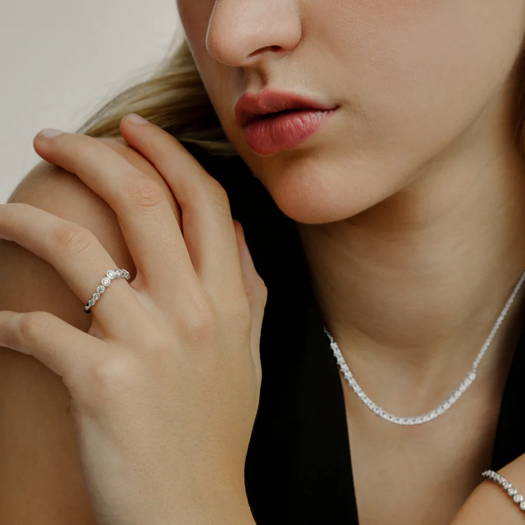 Der VENICE Ring aus rhodiniertem 925/- Sterlingsilber ist mit mehreren funkelnden Zirkonia-Steinen in Zargenfassungen besetzt, die sich gleichmäßig entlang der Ringschiene anordnen. Das fließende Design verleiht dem Ring eine elegante, moderne Ausstrahlung. Das macht den Ring zu einem stilvollen Begleiter, der sich mühelos in unterschiedliche Looks einfügt. Der Ring lässt sich sowohl einzeln tragen als auch im Ring-Stacking kombinieren. Ein zeitloses Schmuckstück für alle, die schlichte Eleganz mit funkelnden Akzenten schätzen.